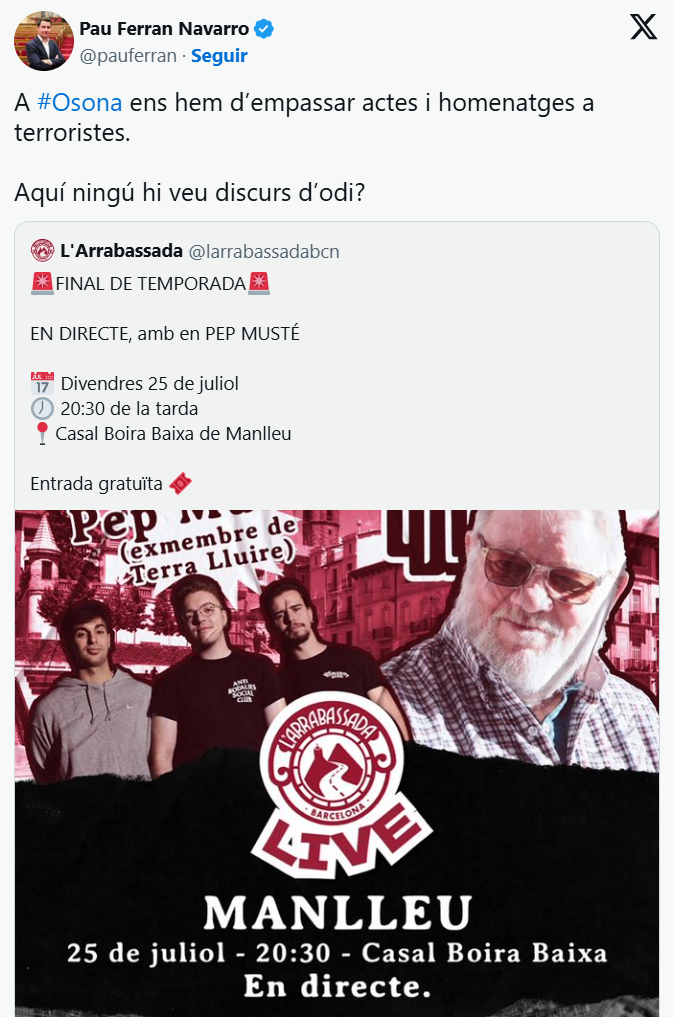 «A Osona ens hem d'empassar actes i homenatges a terroristes. Aquí ningú no veu discurs d'odi?» Ferran ha denunciat el seu perfil de X. Fa referència a un enregistrament d'un podcast que aquest divendres es farà en aquesta localitat, al Casal Boira Baixa, un local de la xarxa d'ateneus radicals de l'entorn de la CUP.